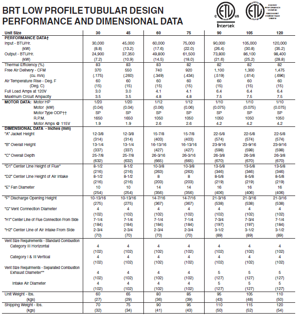 The Beacon-Morris Model “BRT” unit heater conforms with the latest ETL certification standards. Design certified under ANSI Z83.8 for Industrial/Commercial use and the more demanding requirements of CSA .10.96 U.S. (2nd ed.) “Unit Heaters for Residential Installation”, make this low profile unit heater the ideal selection.