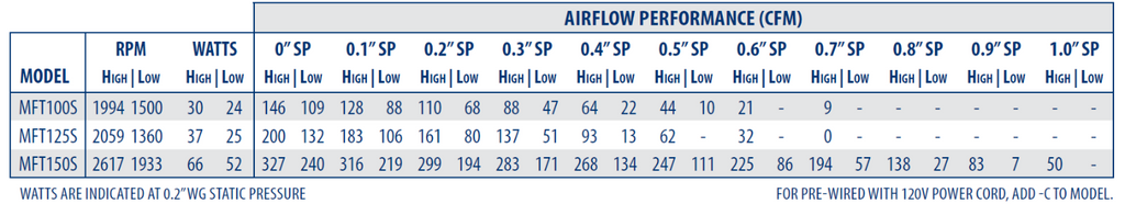 As for construction, MFT-S fans incorporate a durable, UV resistant plastic housing. They utilize a two speed motor that is energy efficient. In addition, the motor and impeller are easy to access.