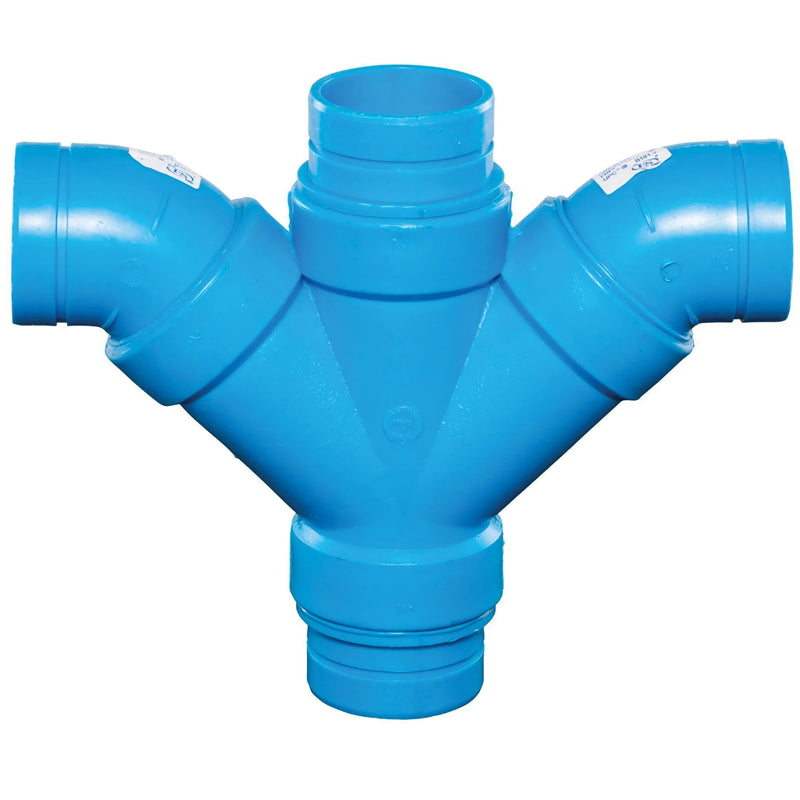 Upgrade your chemical waste system with the ORION 710010 BLUELINE 1-1/2 MJ Double Long Turn Wye FRPP for reliable and efficient directional flow changes.