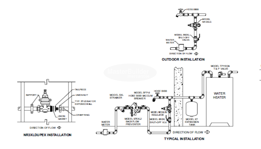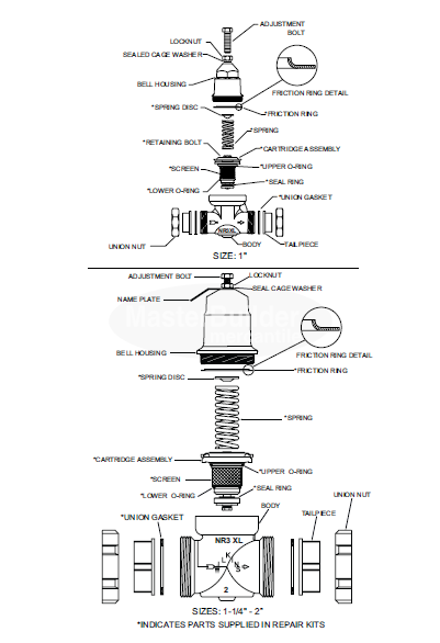 Local codes shall govern installation requirements. Unless otherwise specified, the assembly shall be mounted in accordance with the latest edition of the Uniform Plumbing Code. The Model NR3XL may be installed in any position. If installed in a pit, vault, or inside application, specify the “SC” sealed cage option. The assembly shall be installed with sufficient side clearance for testing and maintenance. Multiple installations are recommended for wide demand variations or where the desired pressure reduction is more than 4 to 1 (ie: 200 psi inlet reduced to 50 psi outlet). CAUTION: Anytime a reducing valve is adjusted, a pressure gauge must be used downstream to verify correct pressure setting. Do not bottom adjustment bolt on bell housing.