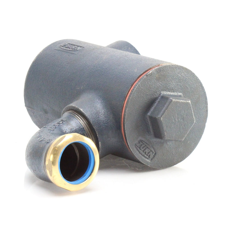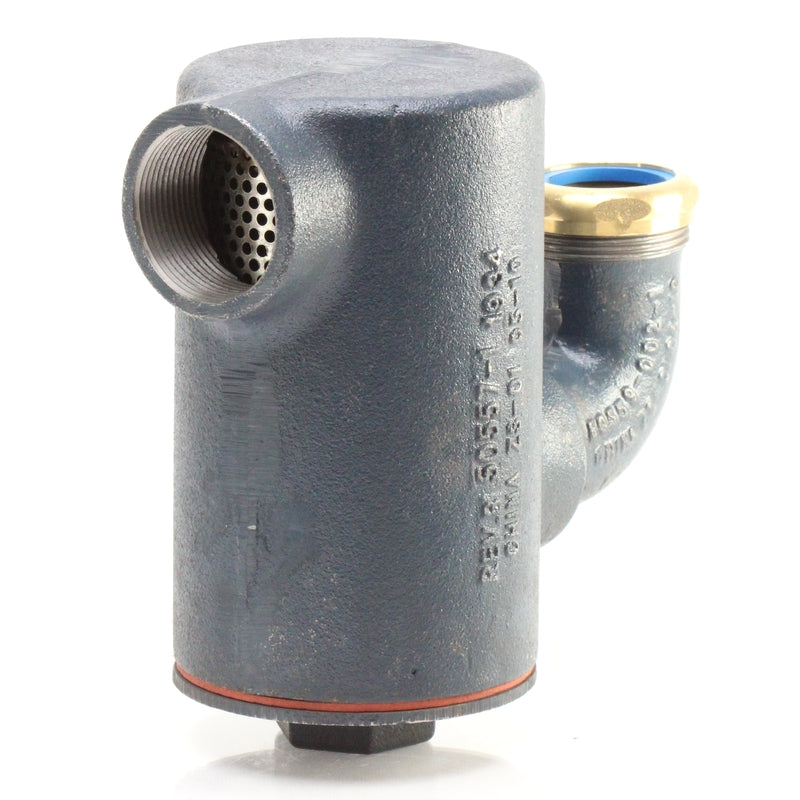 Zurn Z1175 Dura-Coated cast iron hair and solids interceptor, in lieu of fixture 'P' trap, with 1-1/2" [38mm] slip joint elbow inlet and 1-1/2" [38mm] threaded side outlet, perforated stainless steel basket removable from bottom, with flanged and gasketed cleanout cover with raised hex head. Perforation size is 1/8" [3mm].